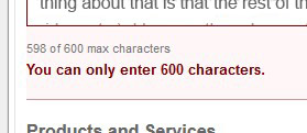 ISSUE: SOLUTION: NOTE: And a personal peeve: The "misplaced only." The word "only" belongs next to the word it modifies. (It should be "You can enter only 600 characters." Technically, putting it before "enter" means you can only enter characters, you can't revise them, etc.) But I hear or see it placed correctly only a few times a year, and have given up on this issue. As long as people understand, that's sufficient. After all, comprehension is at the heart of UX Thinking. FormsSITUATION: RESULT: